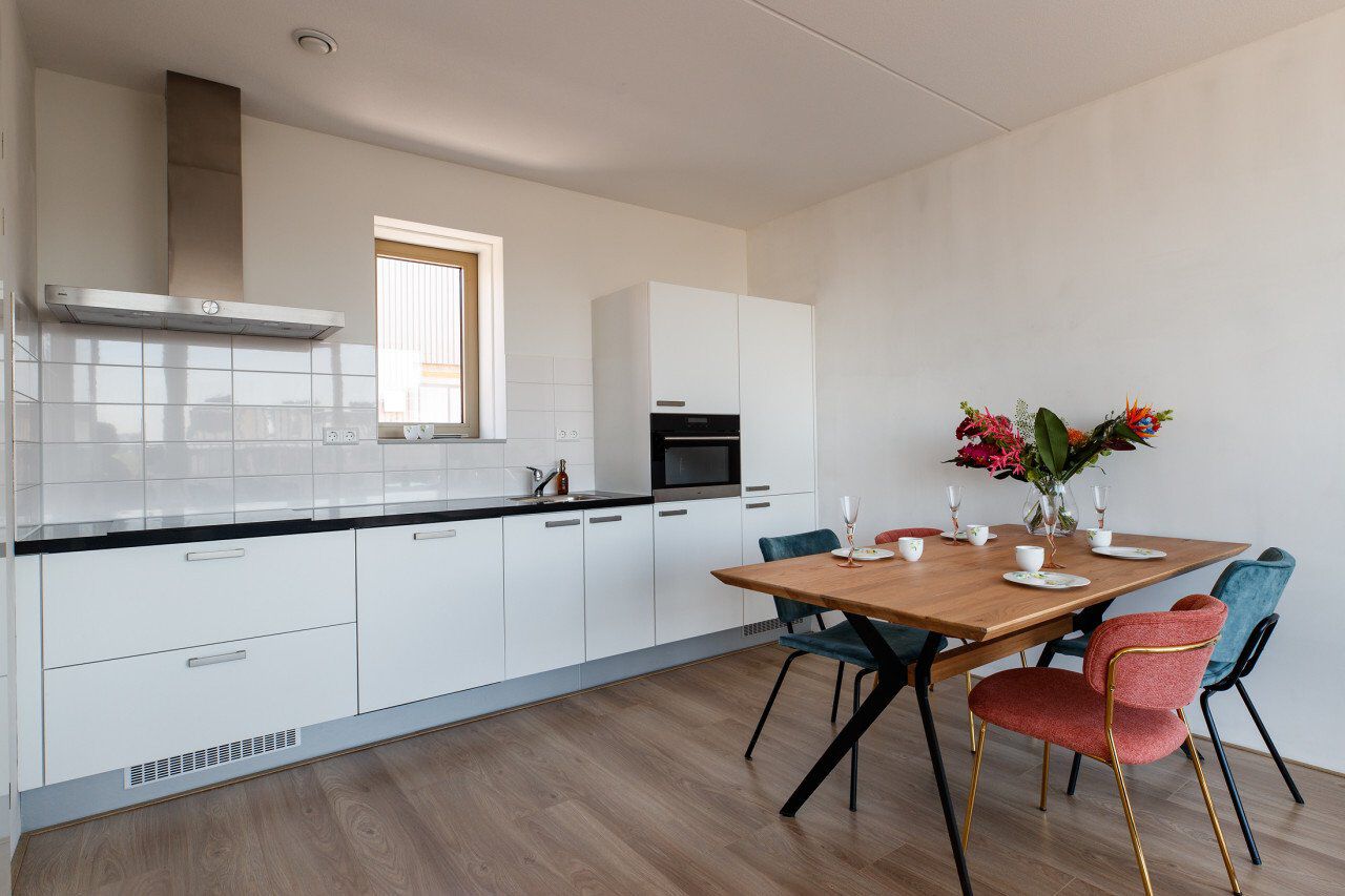 Woonkamer met open keuken • Luxe keuken in rechte opstelling voorzien van zwart composiet aanrechtblad en inbouwapparatuur: koelkast met vriesvak, combimagnetron, inductiekookplaat, wandschouwkap en vaatwasser • Eén slaapkamer met ensuite badkamer • Badkamer voorzien van douche met glazen douchedeur en grote wastafel • Apart toilet • Ruime berging voorzien van opstelplaats voor wasmachine, droger, WPU en WTW • Balkon op het noordoosten • Fietsenstalling in souterrain
