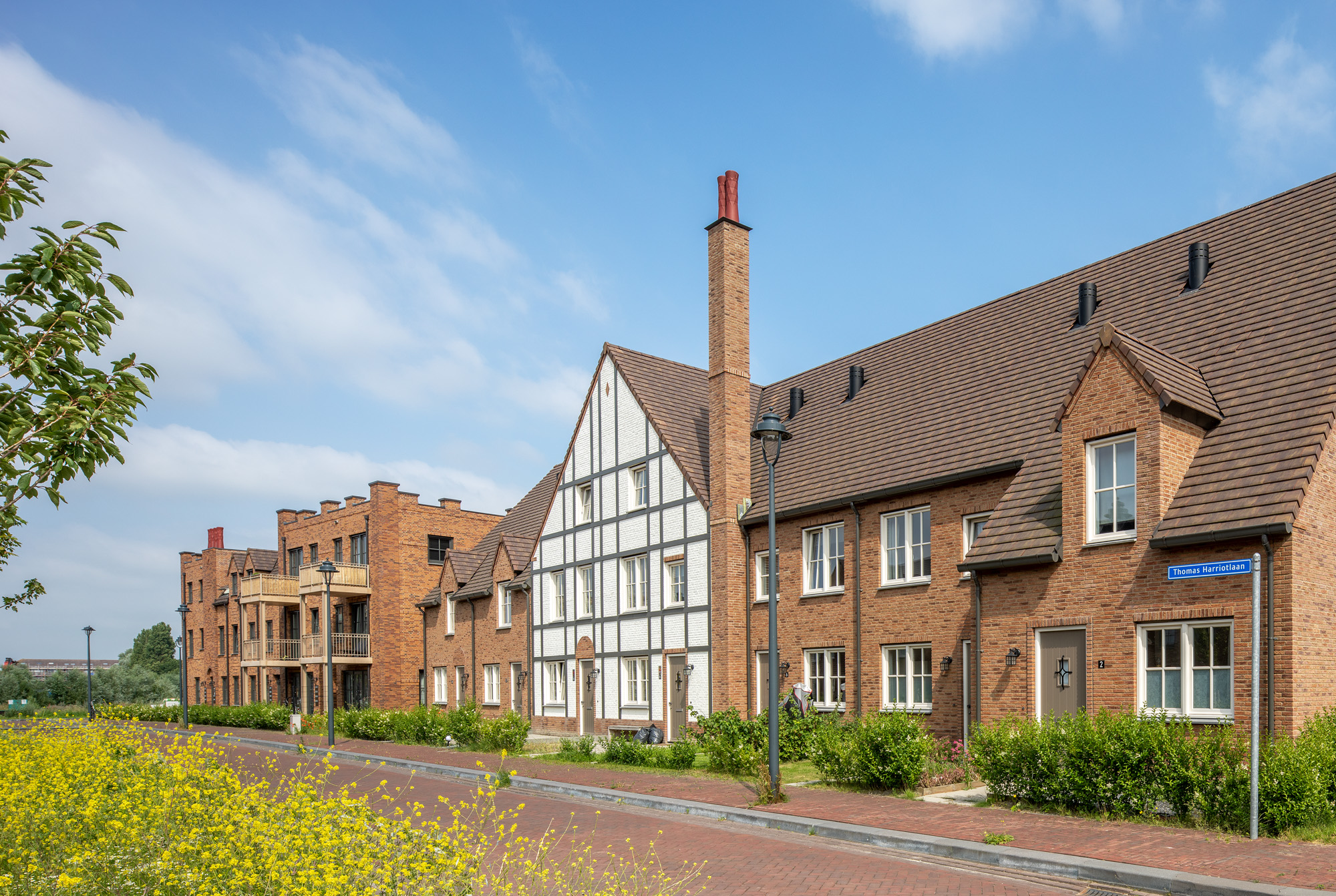 De karakteristieke Engelse Tudorbouwstijl met zijn steile kappen met vlakke pannen, rijke versieringen, afwisselende en verspringende gevels, designschoorstenen en ornamentaal metselwerk geeft de woning een uitgesproken uitstraling.
