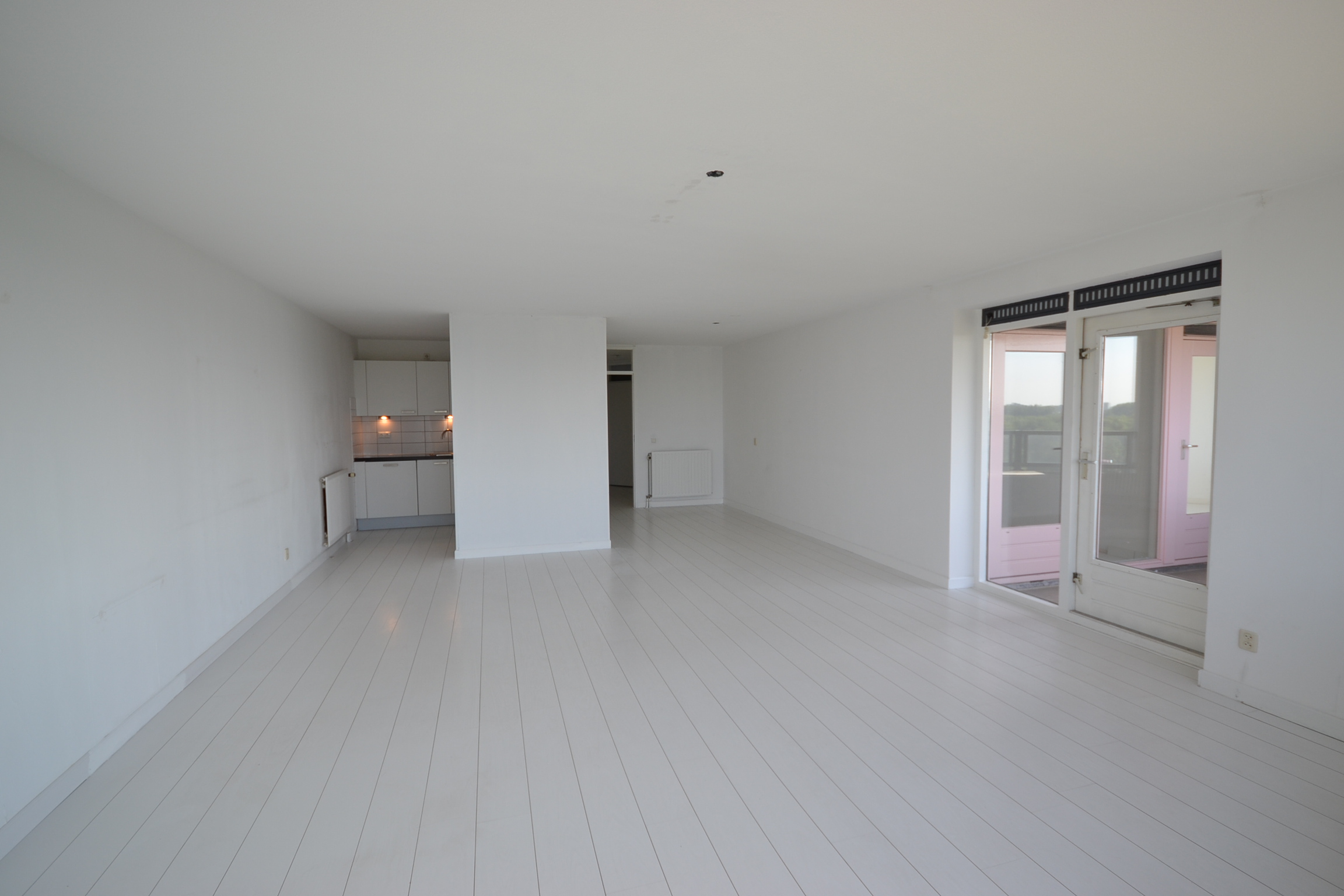 Een 3-kamerappartement met een ruime woonkamer en een halfopen keuken.