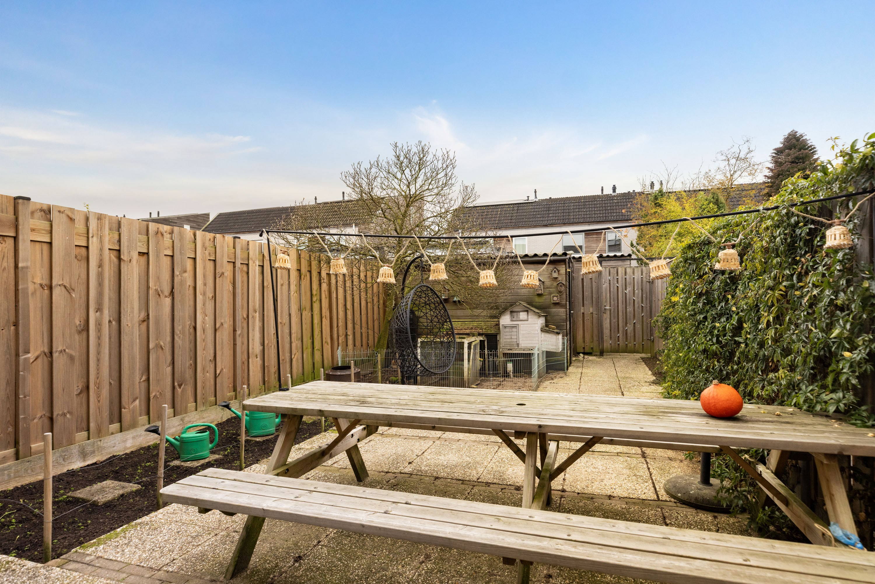 De achtertuin is diep, onderhoudsarm ingericht en biedt veel privacy. De ligging maakt het een ideale plek om vanaf de middag tot in de avond van de zon te genieten. Achterin staat een praktische berging van 8 m², handig voor fietsen en opslag.