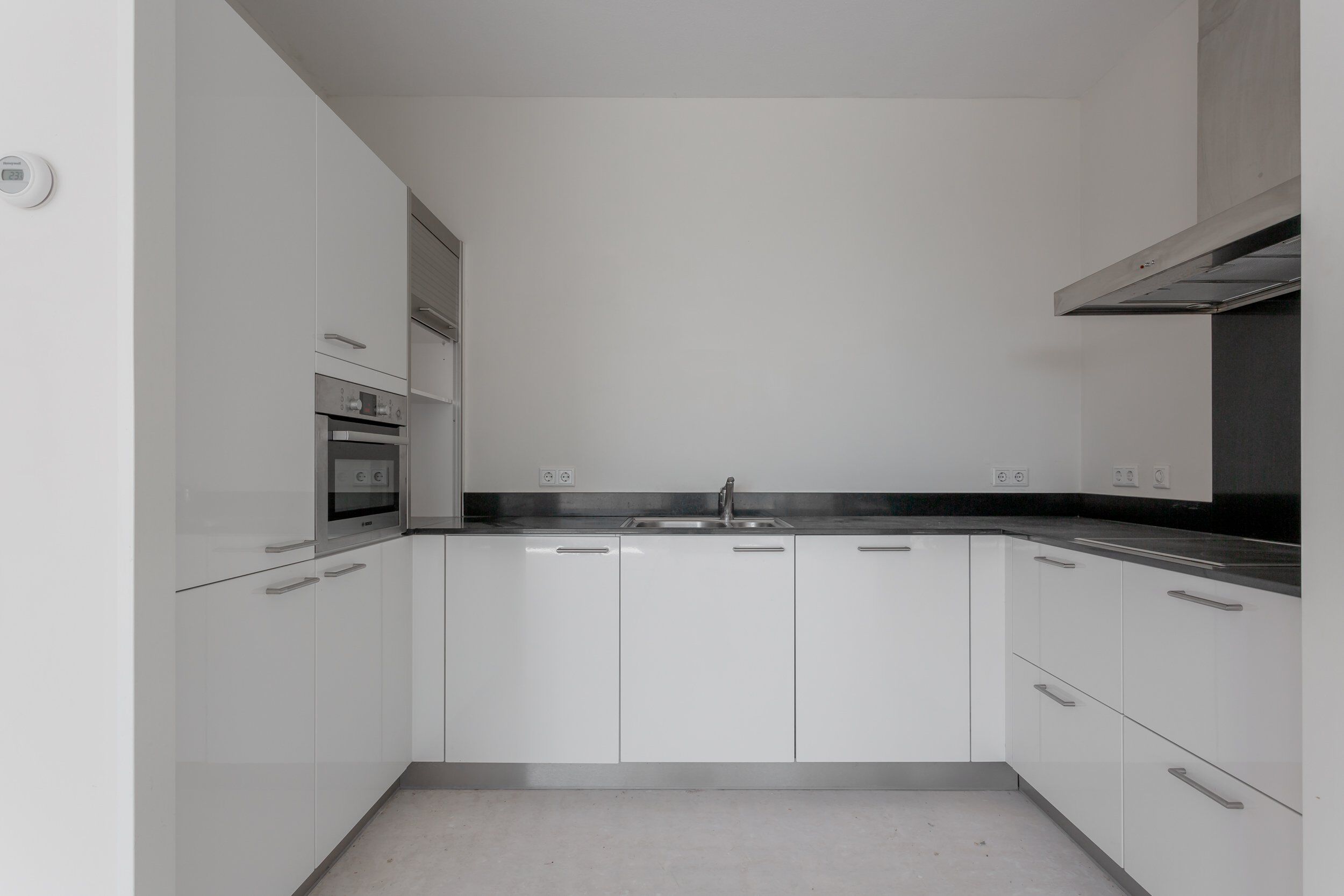 De open keuken is modern uitgevoerd met een zwart composiet werkblad en voorzien van diverse luxe inbouwapparatuur, waaronder: