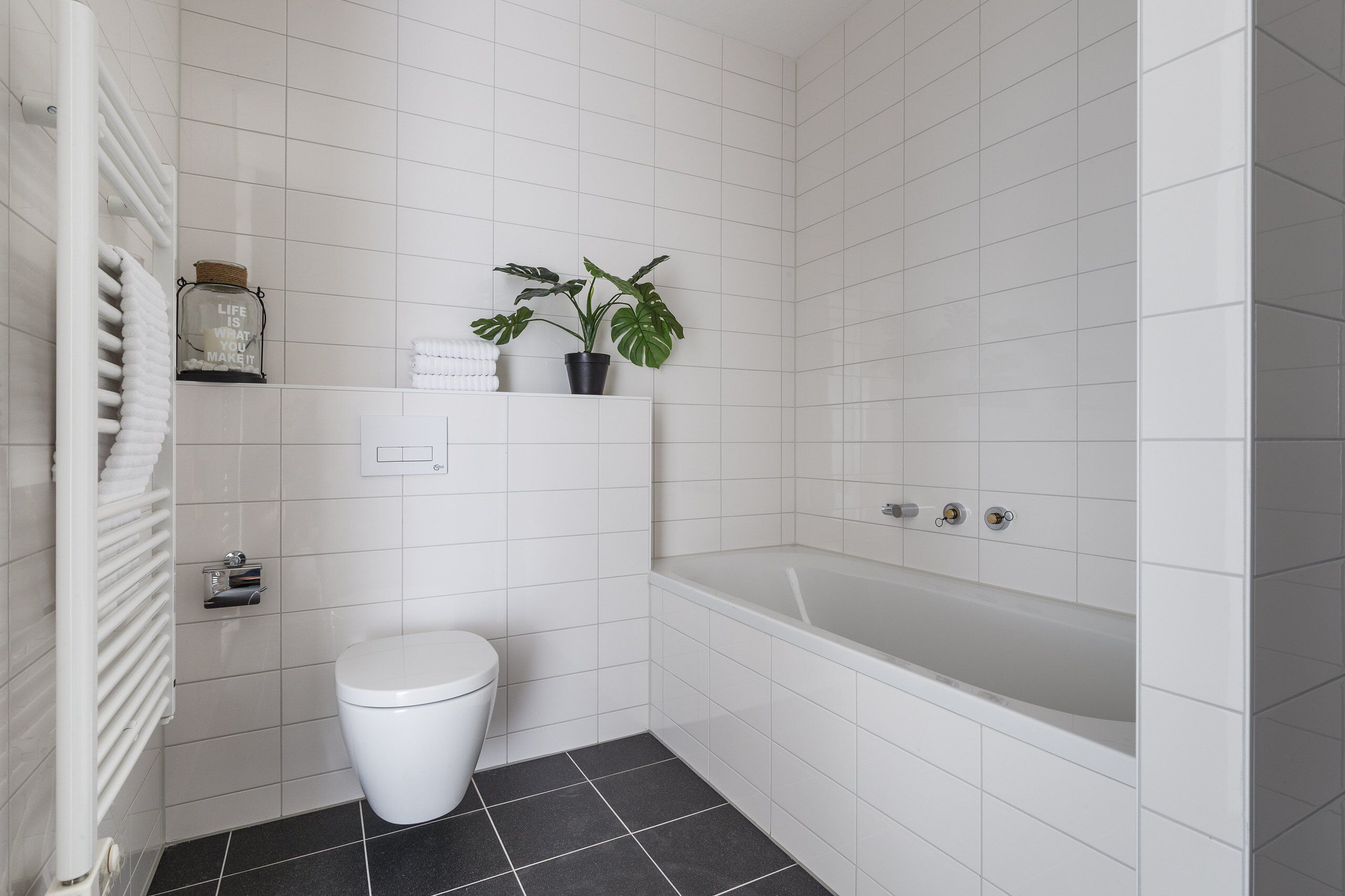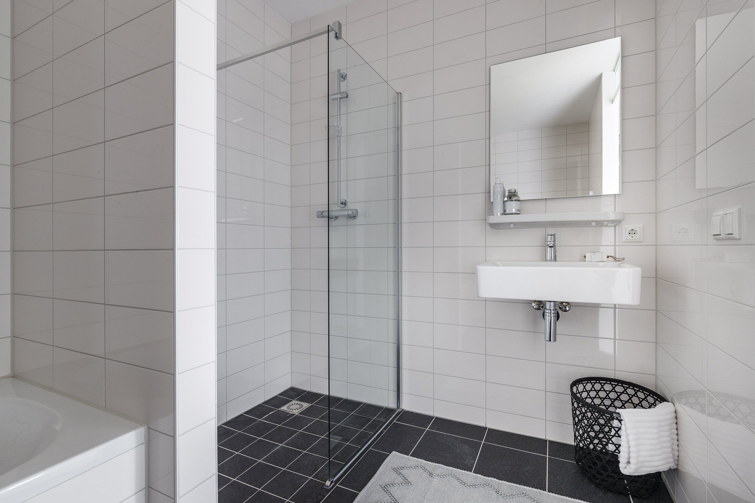 De badkamer is voorzien van een ligbad, inloopdouche, toilet, wastafel met spiegel en een radiator.