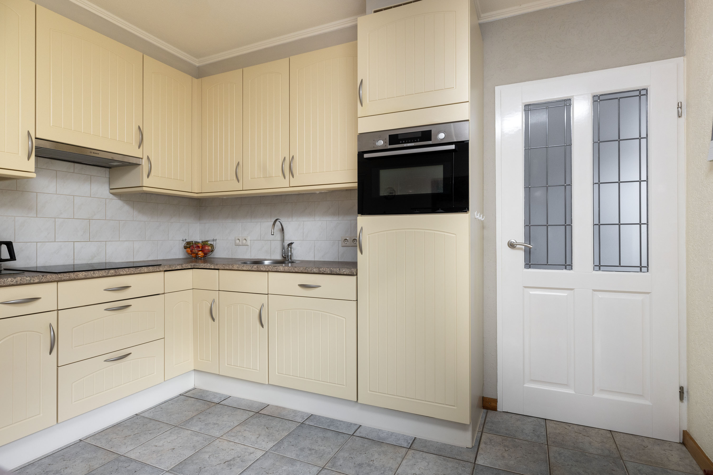 Via de entree bereik je de ontvangsthal, de woonkamer met schuifpui biedt volop plek voor een comfortabele zithoek en een grote eettafel, terwijl de grote ramen zorgen voor een prettige lichtinval en mooi zicht op de omgeving. Deze ruimte is bovendien voorzien van airconditioning. De keuken is functioneel ingericht, in 2023 vernieuwd en voorzien van Bosch inbouwapparatuur.