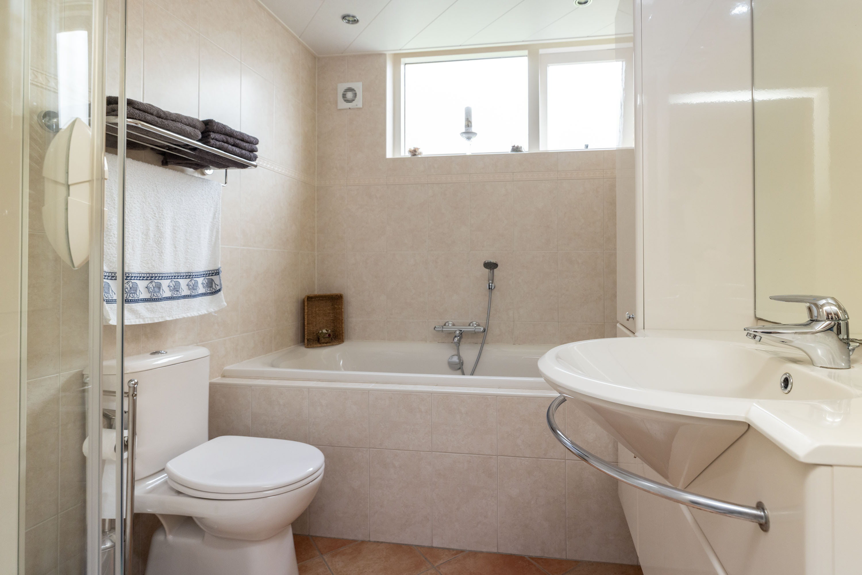 De begane grond is bijzonder praktisch ingedeeld met twee slaapkamers, waardoor levensloopbestendig wonen hier tot de mogelijkheden behoort. De badkamer beschikt over een ligbad, badmeubel, tweede toilet en douche. De overige voorzieningen zoals de bijkeuken zijn eveneens goed bereikbaar, wat het wooncomfort verder vergroot.