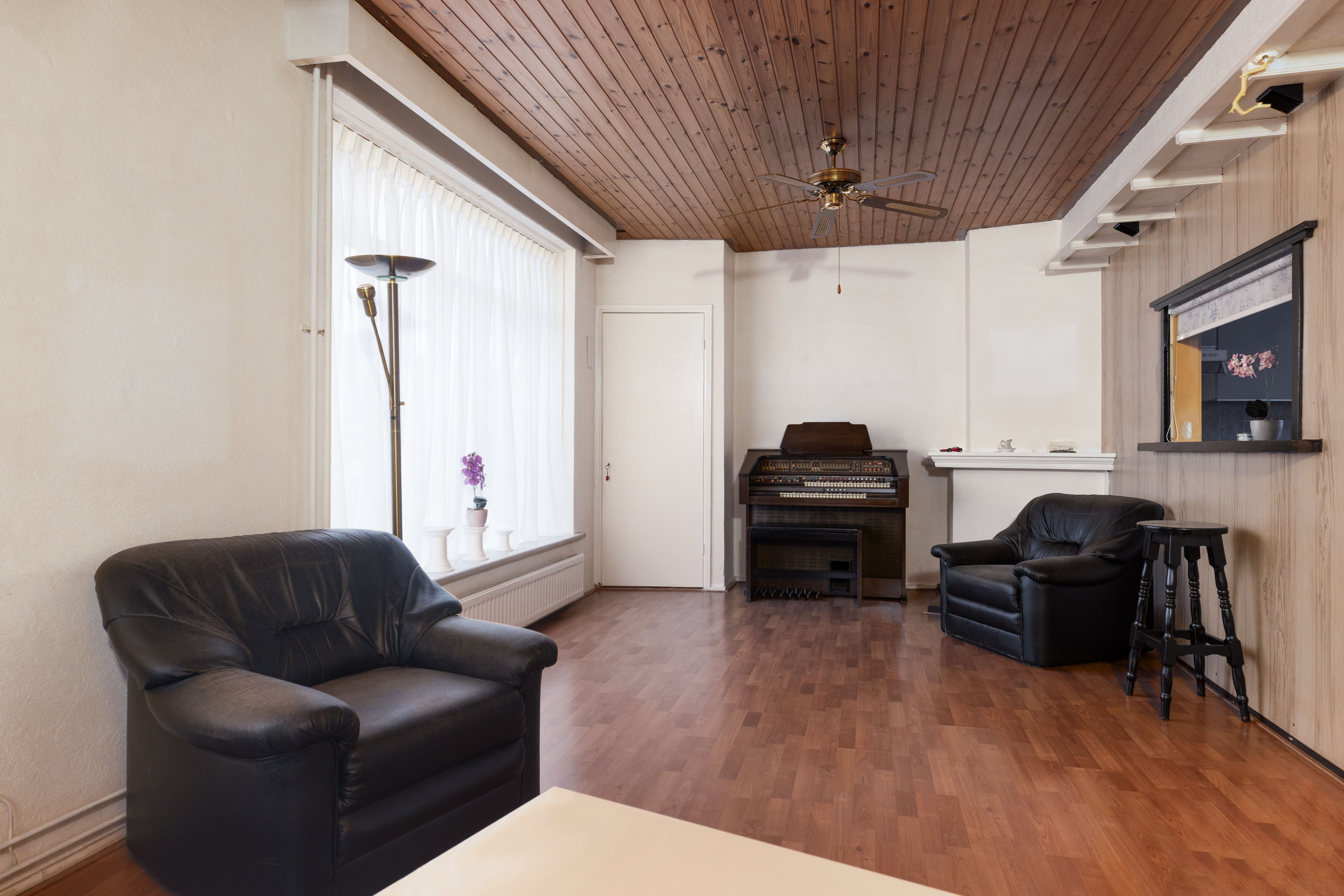 De woonkamer heeft een warme uitstraling door het houten plafond, de laminaatvloer en het karakteristieke doorgeefluik naar de keuken. Deze keuken is eenvoudig maar biedt een fijne, lichte ruimte om een moderne, eigentijdse keuken te realiseren. Zie je het al voor je? Een frisse opstelling, nieuwe apparatuur en een bar aan het doorgeefluik, de perfecte plek om straks te koken én te borrelen.