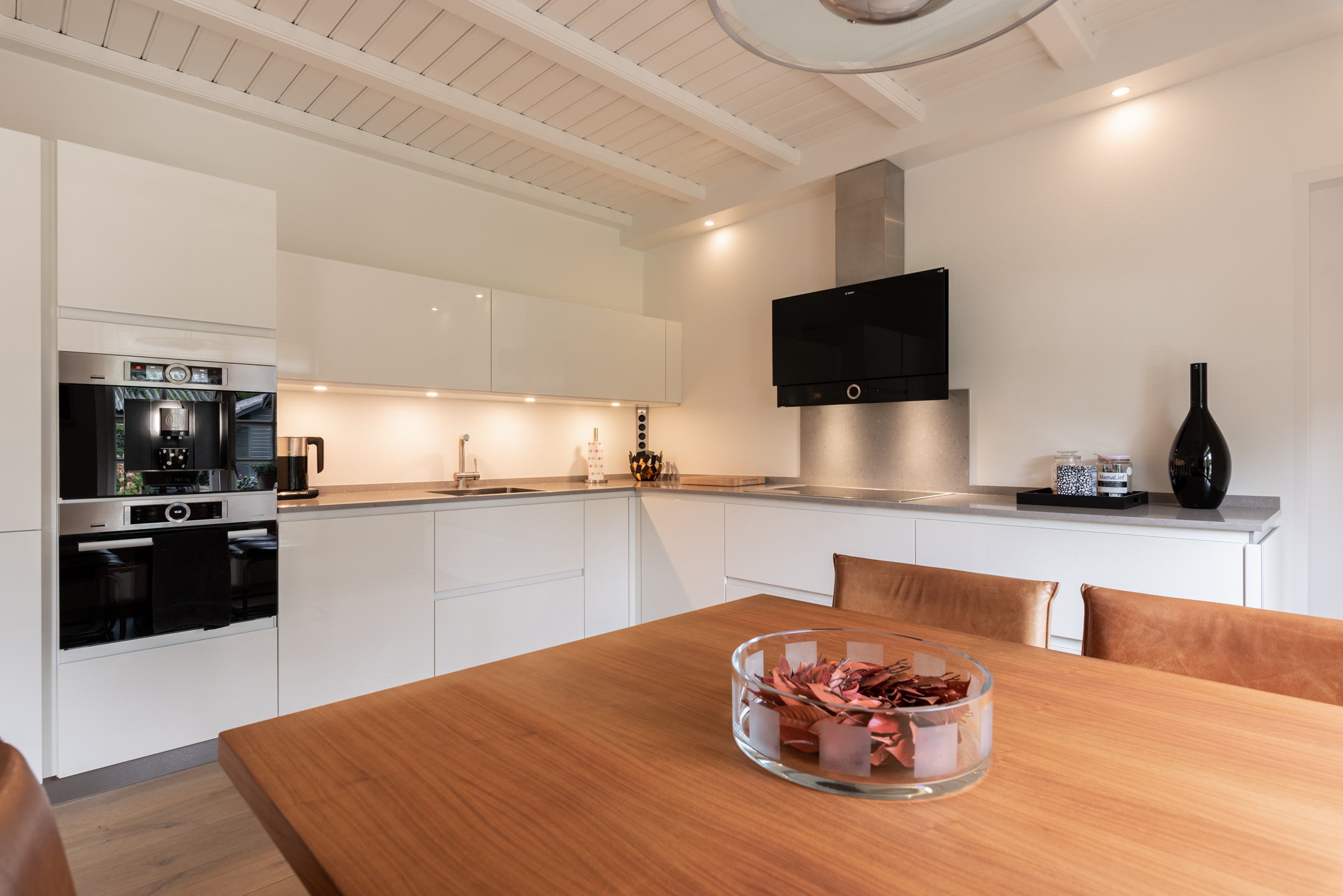 De woonkeuken beschikt over een zeer luxe inbouwkeuken en vormt het hart van het huis. Aansluitend de bijkeuken met granieten werkblad, aansluitingen voor wasmachine en droger en een buitenkraan met warm- en koudwatervoorziening.