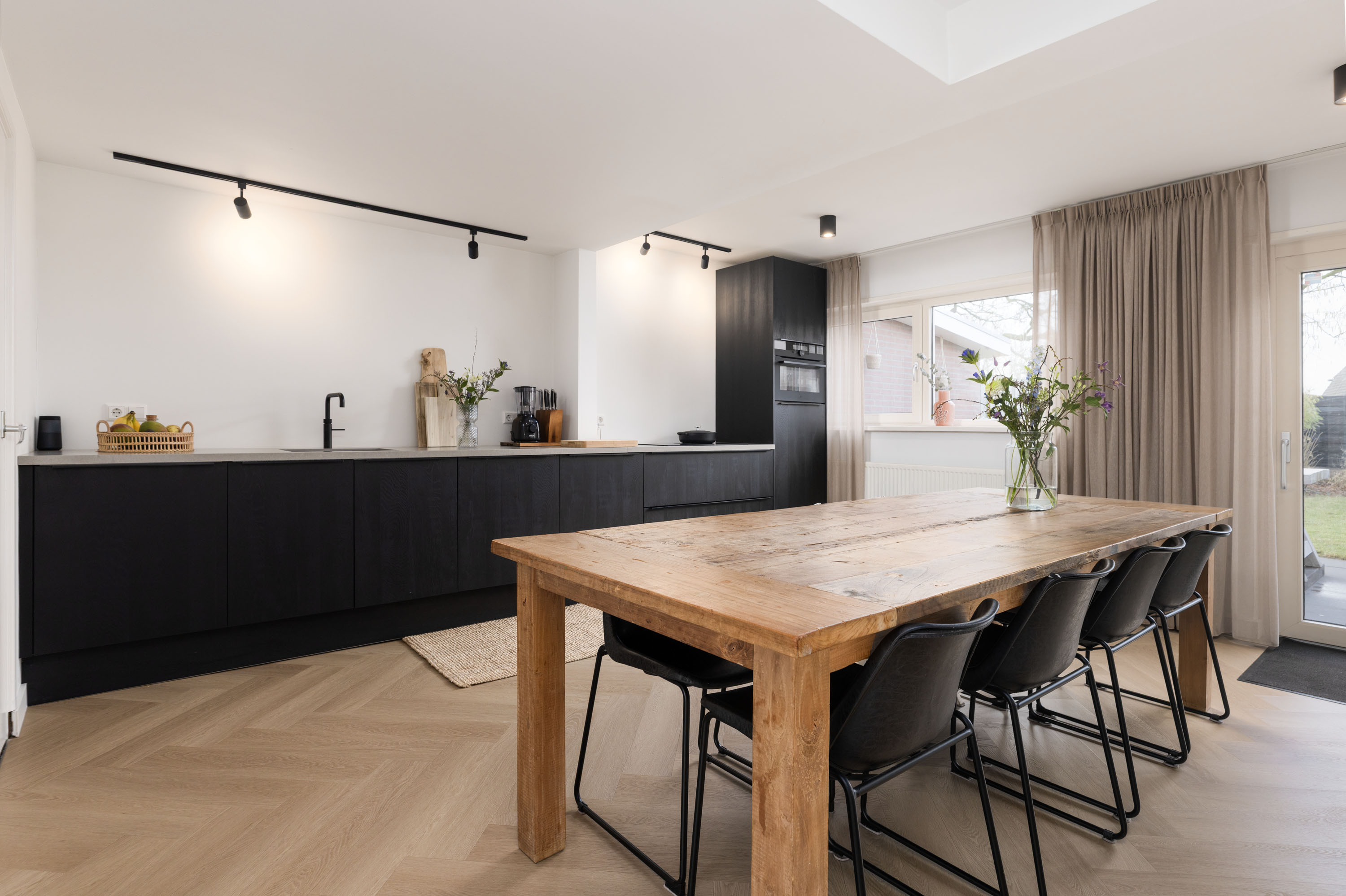 Via de entree kom je in de hal met toilet en toegang tot de woonruimtes. De woning beschikt over een fijne leefruimte met veel lichtinval door de grote raampartijen. De moderne keuken met inbouwapparatuur biedt volop werkruimte en staat in open verbinding met de eetkamer, waardoor het een ideale plek is voor gezellige diners en familiebijeenkomsten. Vanuit de achterzijde is er via de schuifpui toegang tot de tuin.