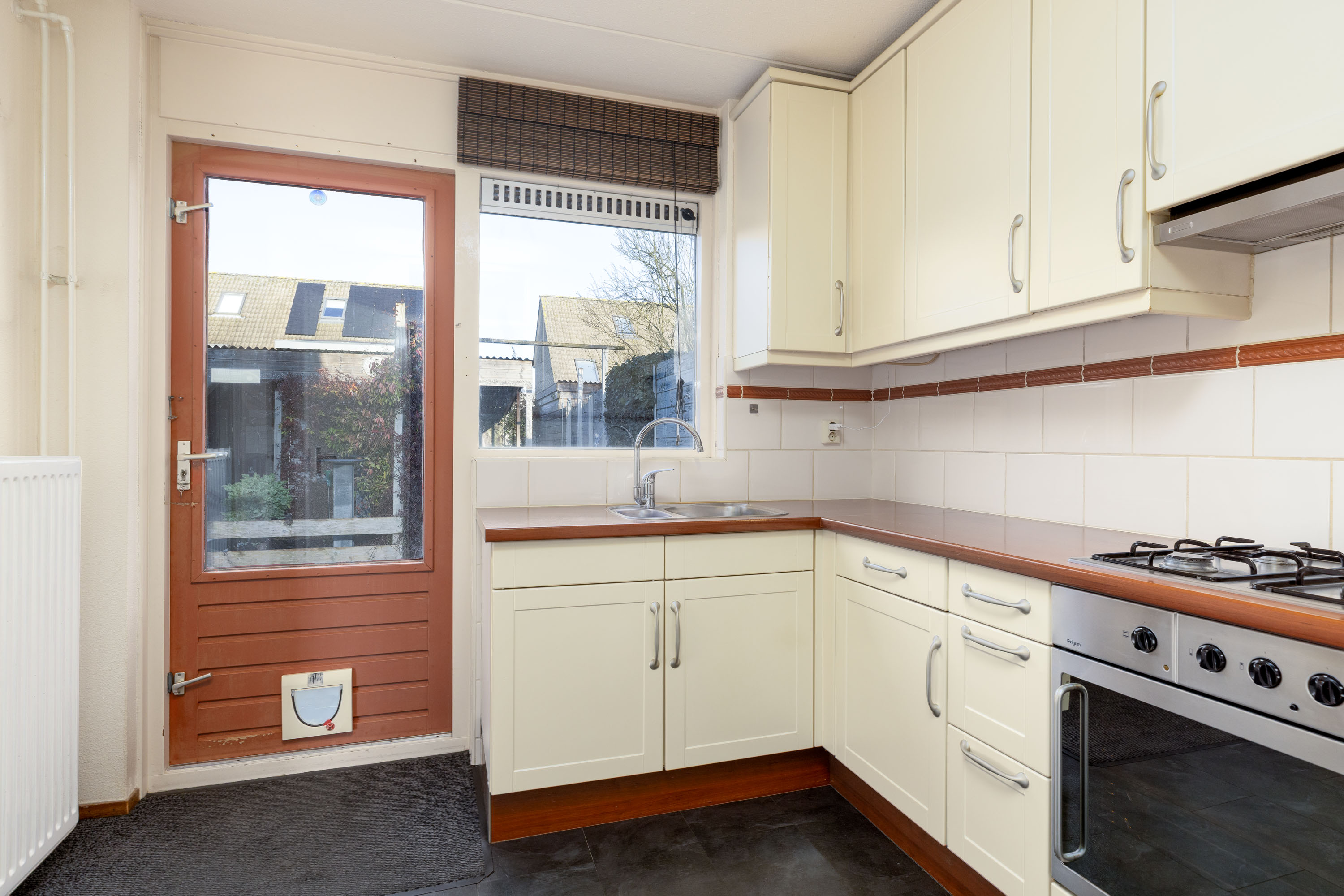 Entree, hal met meterkast, toilet met fonteintje en de trapopgang. Ruime woonkamer van ongeveer 40 m² met de trapkast. Vanuit de woonkamer kom je in de dichte keuken die is geplaatst in een hoekopstelling en is voorzien van inbouwapparatuur. In de bijkeuken hebben we de HR combiketel (bouwjaar 2024) en aansluitpunten voor de wasmachine en de droger. Aansluitend vinden we de garage van circa 16 m². Vanuit de keuken heeft men toegang tot de achtertuin.