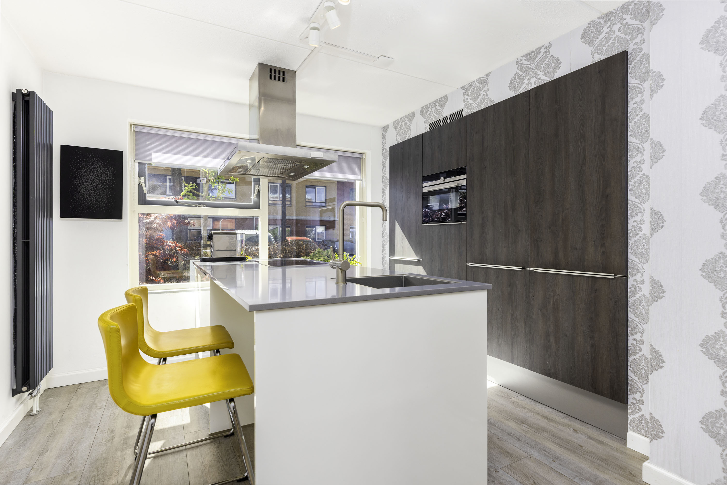 Op de begane grond kom je binnen in de hal met meterkast en de trap naar boven. De inpandige berging is praktisch ingericht met wasmachineaansluiting en de omvormer van de zonnepanelen. De moderne toiletruimte is strak afgewerkt met een hangend wandcloset en fonteintje. De halfopen keuken met kookeiland heeft een luxe uitstraling en is uitgevoerd met een stenen werkblad en diverse inbouwapparatuur zoals een inductiekookplaat, combi-magnetron, koel-/vriescombinatie en vaatwasser. De sfeervolle woonkamer is heerlijk licht en staat via dubbele tuindeuren in direct contact met de achtertuin.
