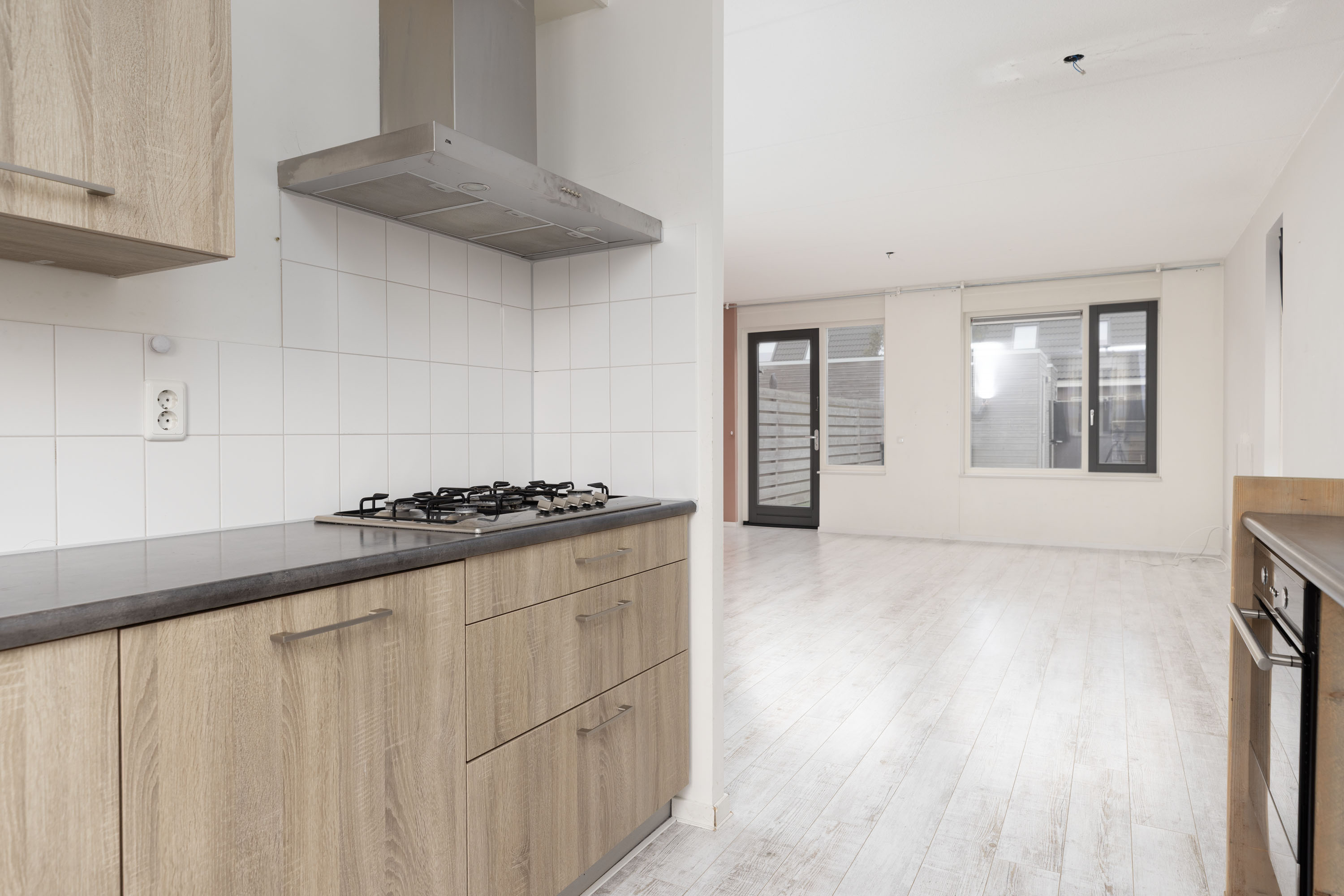 Entree met een ruime hal, toilet in een wanduitvoering met een fonteintje, meterkast en de trap naar de verdiepingen. Ruime - en tuingerichte woonkamer van circa 30 m² en een moderne open keuken aan de voorzijde welke o.a. is voorzien van een 5 pits gaskookplaat, afzuigkap, oven, extra werkblad en een combimagnetron. Vanuit de woonkamer heb je direct toegang tot de achtertuin en de berging. De gehele begane grond is voorzien van een laminaatvloer.