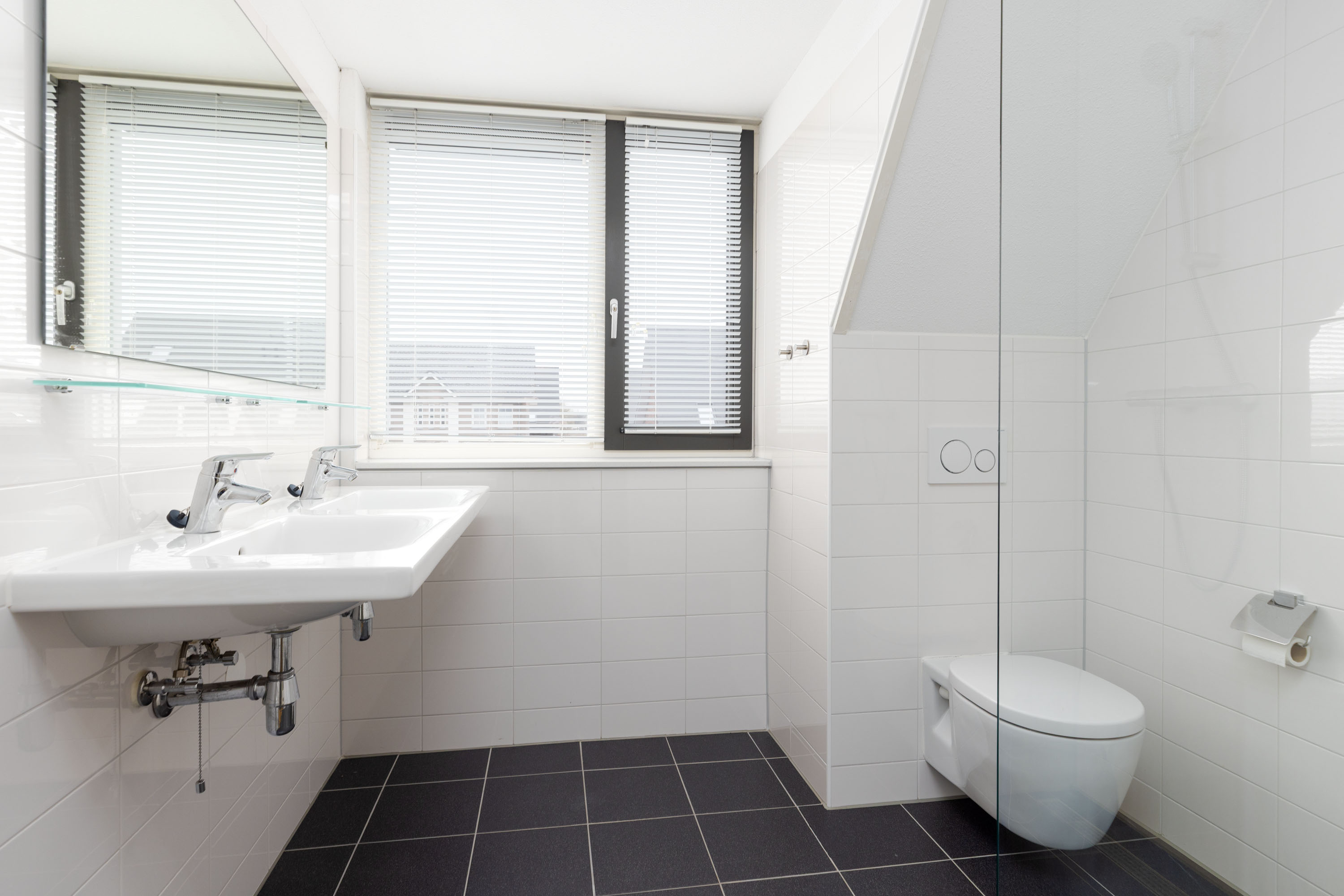 Overloop en totaal drie mooie slaapkamers van 7 m², 11 m² en 11 m². De moderne badkamer heeft de beschikking over een ruime inloopdouche, dubbele wastafel, design radiator en een tweede wandtoilet. Via een vaste trap kom je op de tweede verdieping. De gehele eerste verdieping is net als de begane grond voorzien van een laminaatvloer.