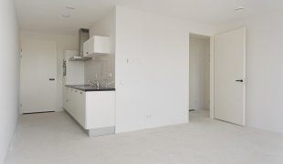 Het appartement is gelegen op de negende verdieping van het complex 'De Bakermat'. Het appartement is voorzien van een woonkamer met open keuken, badkamer, separaat toilet, kleine berging met wasmachine- en drogeraansluiting, een slaapkamer en balkon. De keuken is voorzien van inbouwapparatuur met een vaatwasser, combimagnetron, inductiekookplaat, afzuigkap en koel-vriescombinatie en de woonkamer biedt toegang tot het balkon van circa 8 m2. De badkamer beschikt over een inloopdouche met glazen wand, dubbele wastafel met spiegel en radiator.