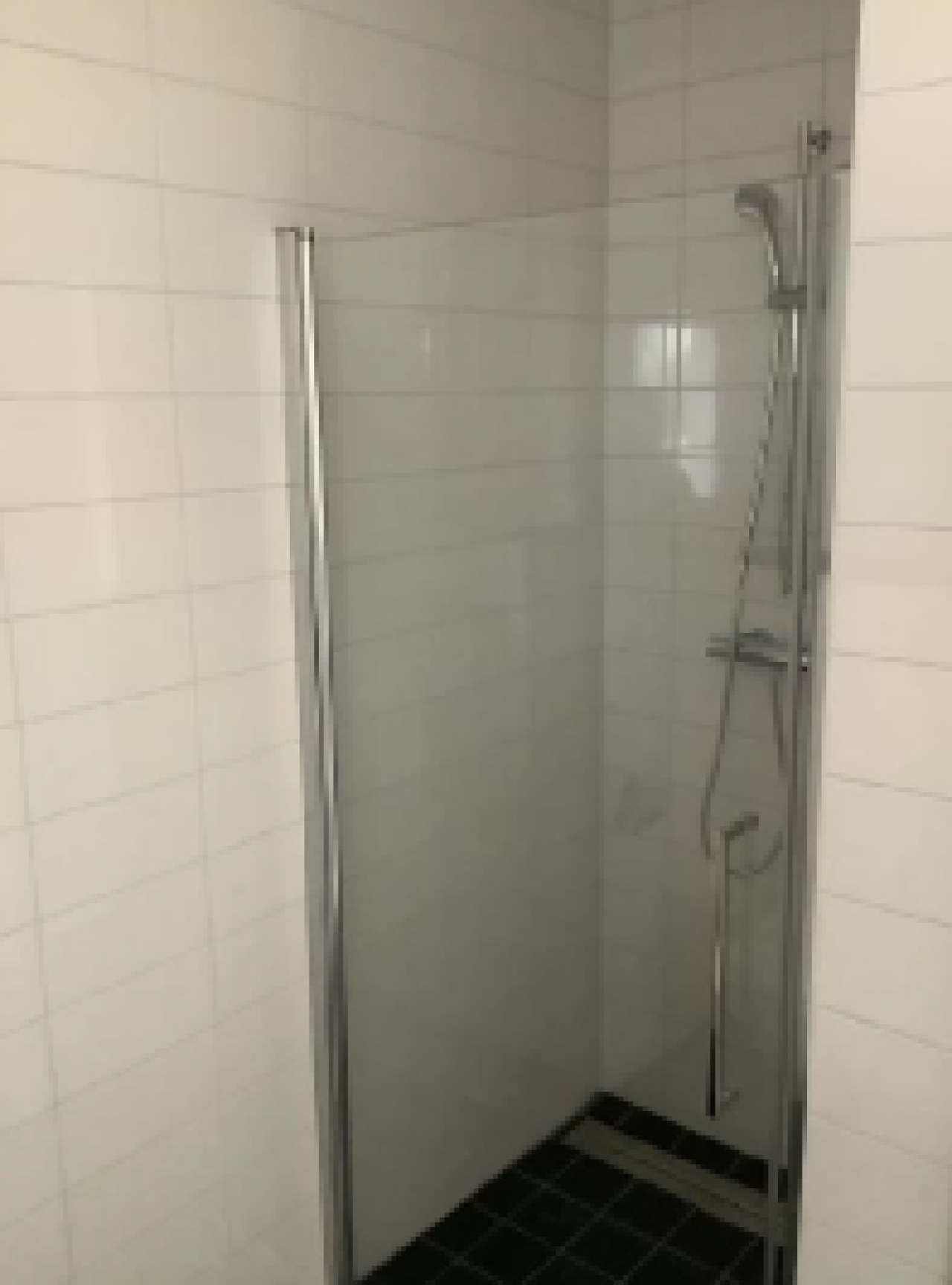 douche met glazen douchedeur, wastafel en toilet • Bergkast met opstelplaats