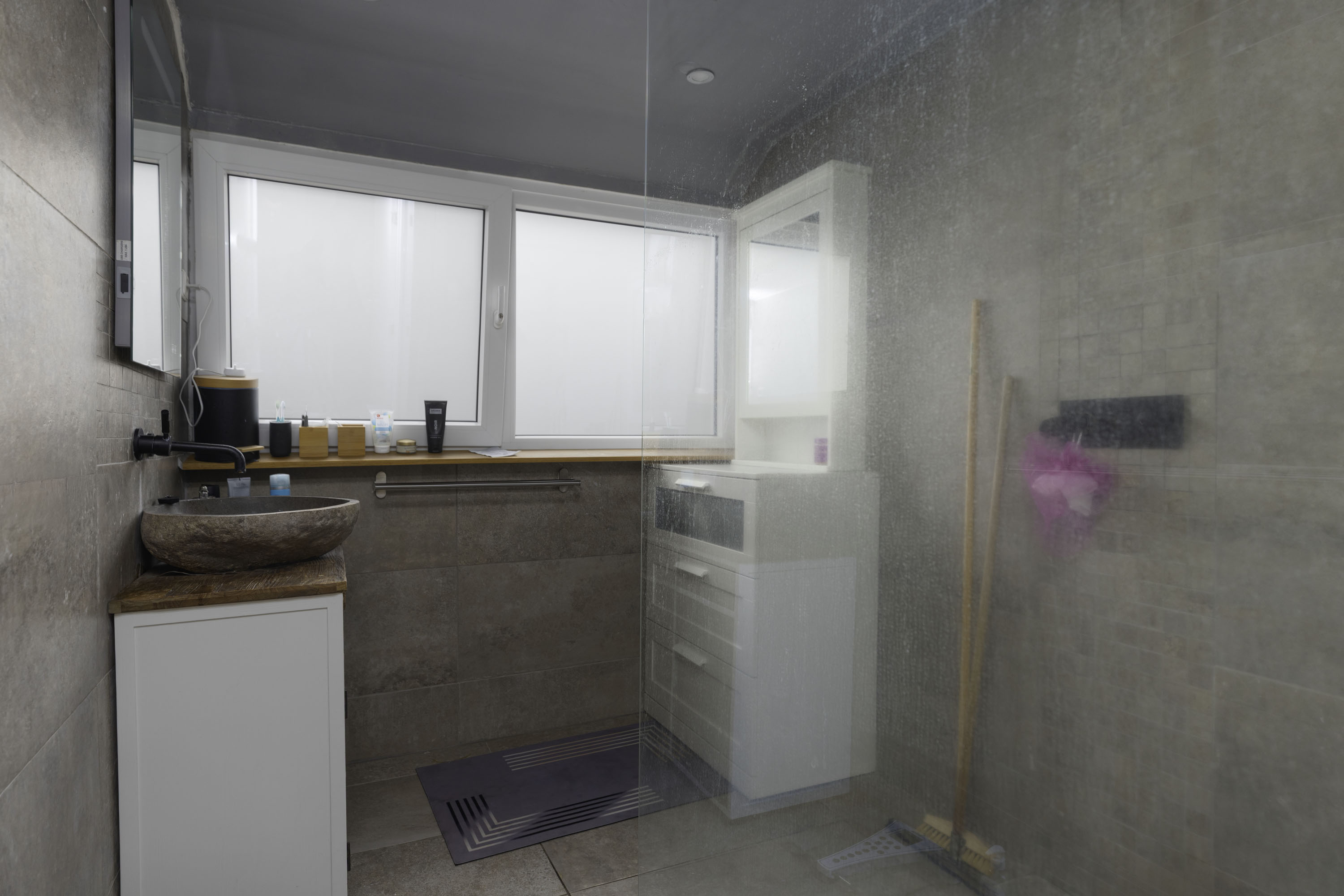 Overloop, twee slaapkamers, een aparte wasruimte en een badkamer uit 2019 met een ruime inloopdouche en een badkamermeubel.