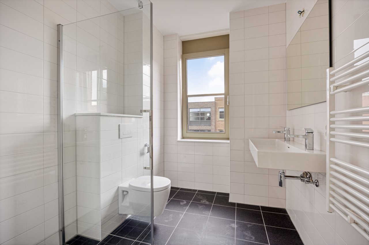 Woonkamer met open keuken, deur naar loggia • Keuken in rechte opstelling voorzien van zwart composiet aanrechtblad en inbouwapparatuur: koelkast met vriesvak, combimagnetron, inductiekookplaat, wandschouwkap en vaatwasser • Een slaapkamer • Badkamer voorzien van douche met glazen douchewand en wastafel • Separaat toilet • Berging voorzien van opstelplaats voor wasmachine en droger • Stadsverwarming • Vloerverwarming