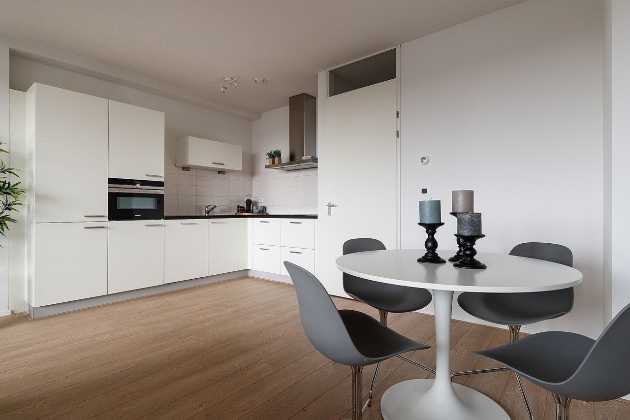 In de hal vindt u een berging en de toiletruimte. Vanuit de hal betreedt u de woonkamer met open keuken voorzien van luxe inbouwapparatuur, zoals, afzuigkap, keramische kookplaat, combimagnetron, koel/vriescombinatie en vaatwasser. Vanuit de woonkamer heeft u toegang tot een loggia. De badkamer is voorzien van een douche en wastafel. Het appartement beschikt over twee slaapkamers en heeft een aparte bergruimte in de kelder en een parkeerplaats.