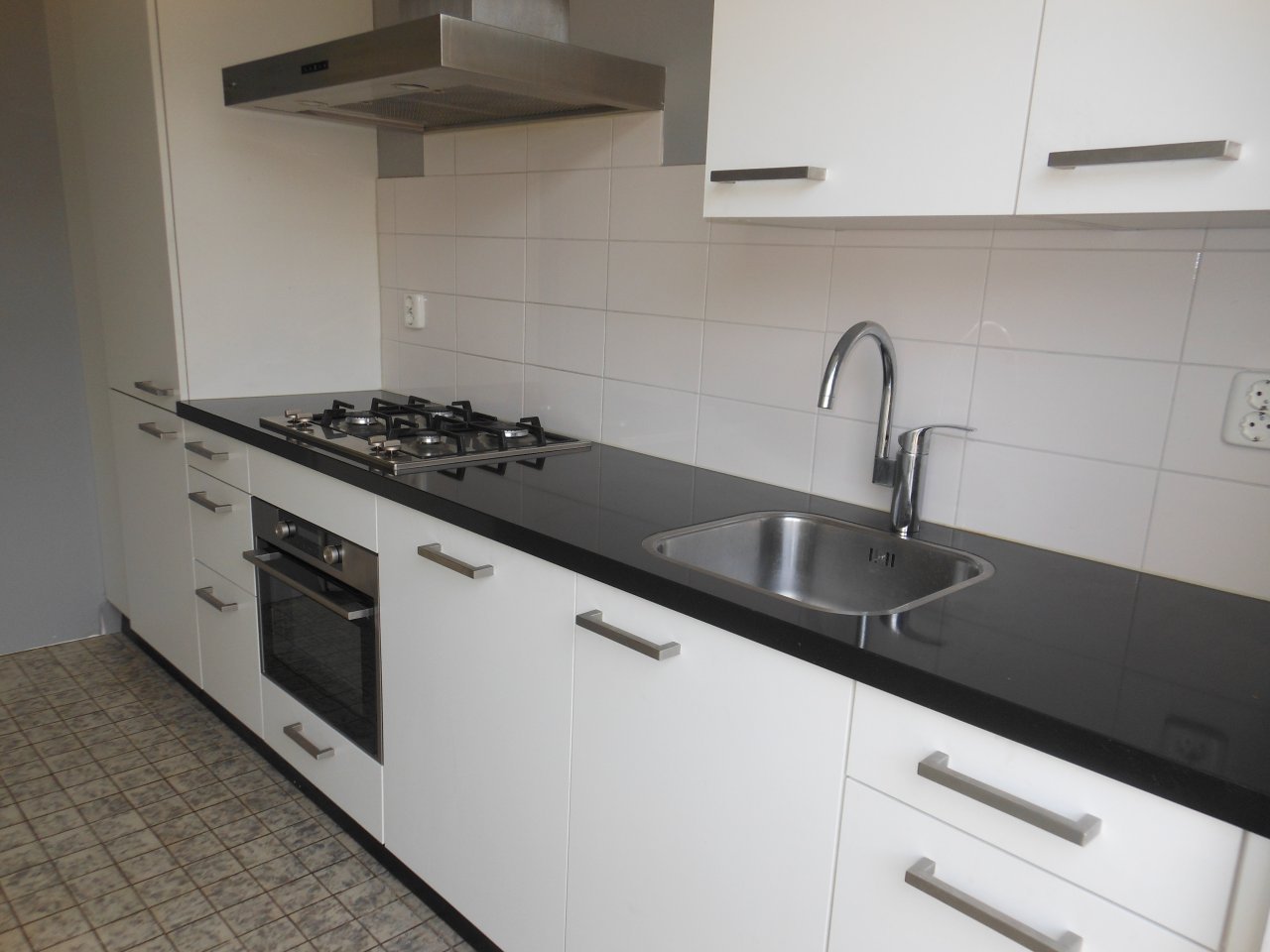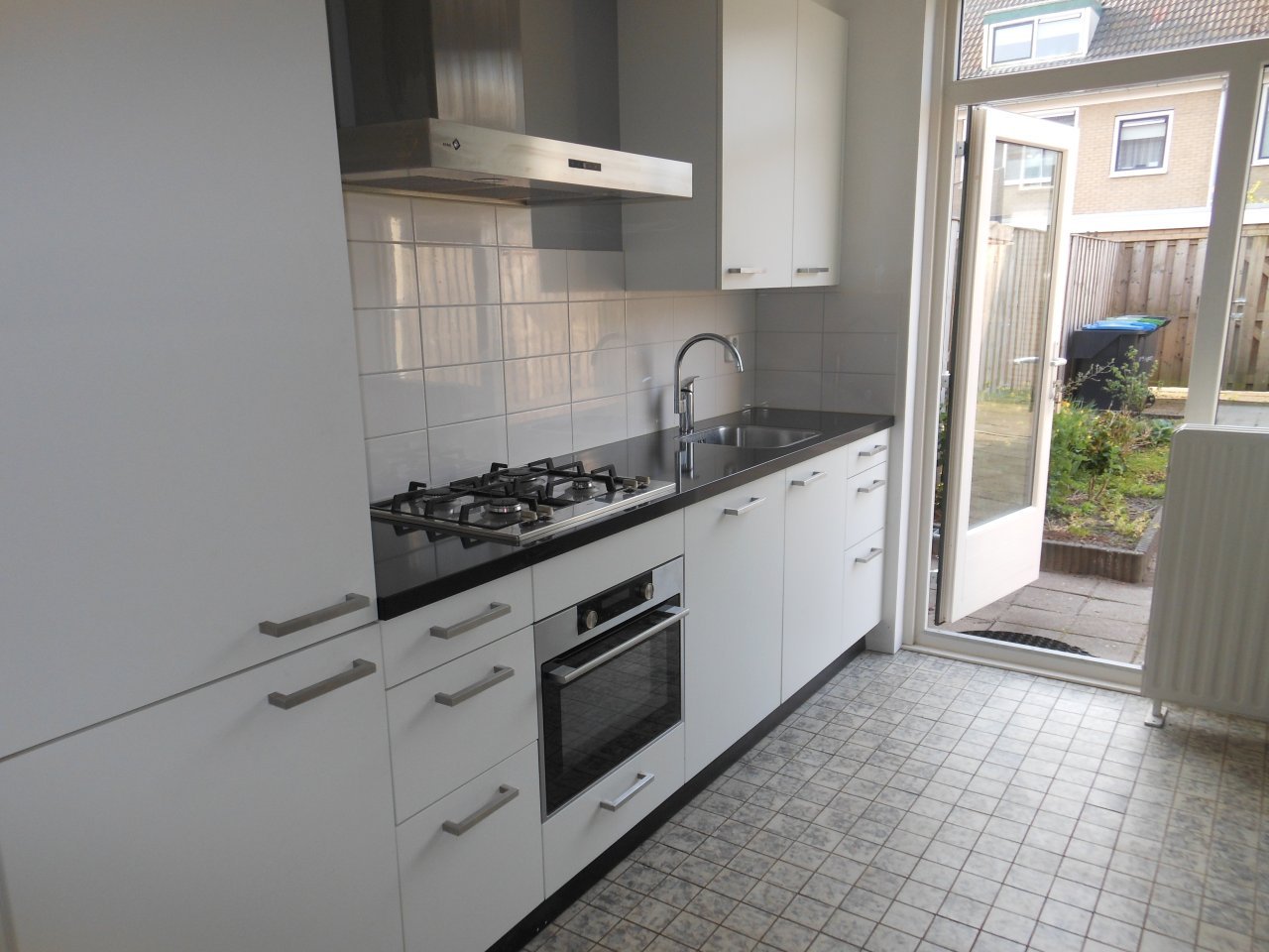 Hal met meterkast, toilet en trapopgang, ruime doorzon-woonkamer, gesloten keuken met toegang tot de achtertuin.